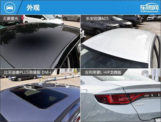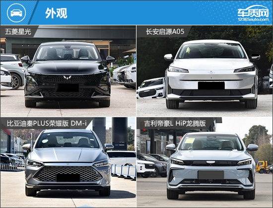 外觀方面,四款車型均有明顯的家族化設(shè)計元素,具有很高的辨識度。其中,長安啟源A05和吉利帝豪L HiP龍騰版采用半封閉式前格柵,視覺效果更接近純電動車型。五菱星光和比亞迪秦PLUS榮耀版 DM-i則是保留了傳統(tǒng)進(jìn)氣格柵,前者的格柵采用全黑設(shè)計,后者則是格柵內(nèi)部采用點陣式設(shè)計。
