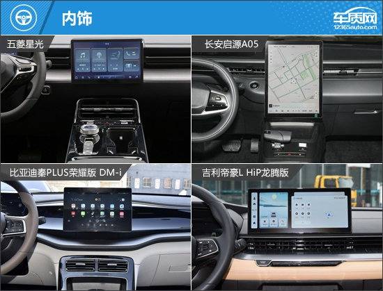 內(nèi)飾設(shè)計方面,四款車型都非常注重科技感的營造,配備懸浮式中控屏幕,且除吉利帝豪L HiP龍騰版之外,都搭載懸浮式液晶儀表。其中,長安啟源A05中控屏幕尺寸最大,達(dá)到13.2英寸,五菱星光和比亞迪秦PLUS榮耀版 DM-i較小,為10.1英寸。液晶儀表尺寸方面,五菱星光最小,僅有7英寸,長安啟源A05和吉利帝豪L HiP龍騰版達(dá)到10.25英寸。為了提升內(nèi)飾的開闊感,五菱星光、長安啟源A05和吉利帝豪L HiP龍騰版都采用貫穿式內(nèi)飾設(shè)計。