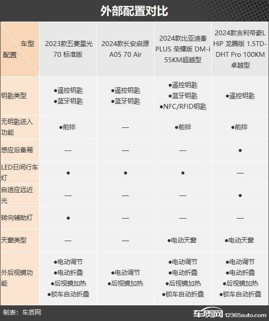 外部配置方面,長安啟源A05表現(xiàn)墊底,缺失電動天窗和無鑰匙進(jìn)入功能,且外后視鏡功能最少,僅有電動調(diào)節(jié)和后視鏡加熱兩項。相比之下,吉利帝豪L HiP龍騰版在外部配置方面表現(xiàn)最優(yōu),獨享的感應(yīng)后備廂和自適應(yīng)遠(yuǎn)近光,日常實用性很強(qiáng)。