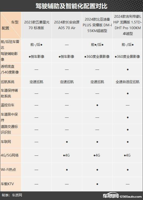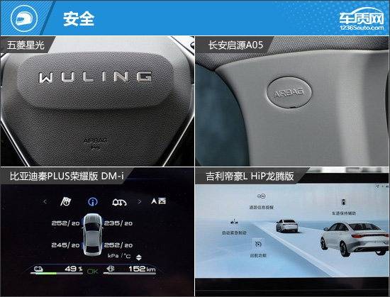 駕駛輔助功能方面,吉利帝豪L HiP龍騰版表現(xiàn)最佳,獨享全速自適應(yīng)巡航、車道保持輔助系統(tǒng)、車道居中保持、道路交通標(biāo)識識別。比亞迪秦PLUS榮耀版 DM-i通過獨享遙控泊車,成功扳回一城。五菱星光和長安啟源A05整體表現(xiàn)一般。