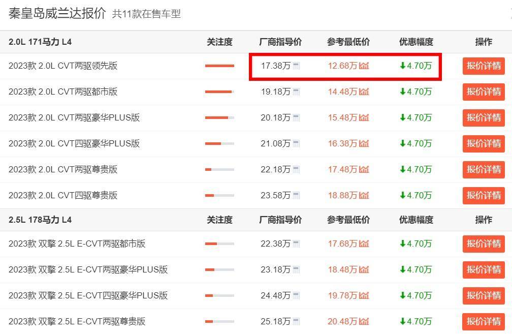 從秦皇島地區(qū)經(jīng)銷商所給出的報價信息來看,原本廠商指導(dǎo)價為17.38萬的威蘭達2023款 2.0L CVT兩驅(qū)領(lǐng)先版車型,目前已經(jīng)可以做到優(yōu)惠4.7萬。而優(yōu)惠完之后,新車的參考最低價也已經(jīng)來到了12.68萬,可以說是極具性價比的這么一個價位區(qū)間了。