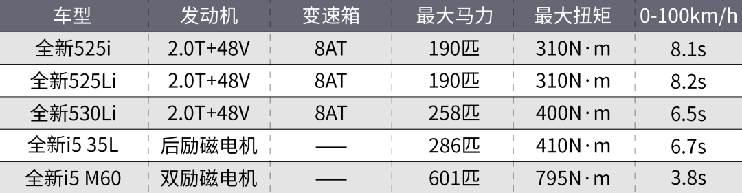 動力方面,燃油版的5系全系采用2.0T發動機搭配8AT變速箱,提供高低功率版本,目前僅提供后輪驅動,后續會有xDrive四驅車型上市。而純電的i5,國產長軸版采用單電機驅動,進口高性能M60則是雙電機四驅。