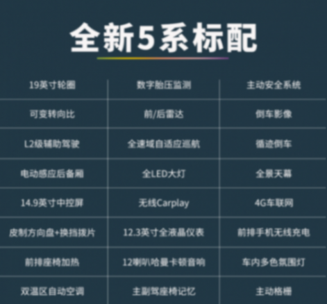 說完車輛的基本規格,我們再來看看配置。以燃油版5系為例,在基礎配置上,即使是最入門的525Li車型,在配置上也不寒酸,除了常規的LED大燈、倒車雷達、倒車影像外,也標配L2級輔助駕駛、循跡倒車、電動尾門、前排座椅加熱、哈曼卡頓音響、手機無線充電等配置,加上不錯的空間和舒適性,如果大家對于動力沒有太高的需求,那么43.99萬的525Li就已經足夠了。