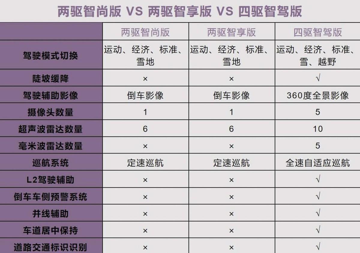 之所以沒(méi)有推薦兩驅(qū)智享版,因?yàn)樗m然比兩驅(qū)智尚版貴兩萬(wàn),但是配置并沒(méi)有多很多,所以不如直接上四驅(qū)智駕版。