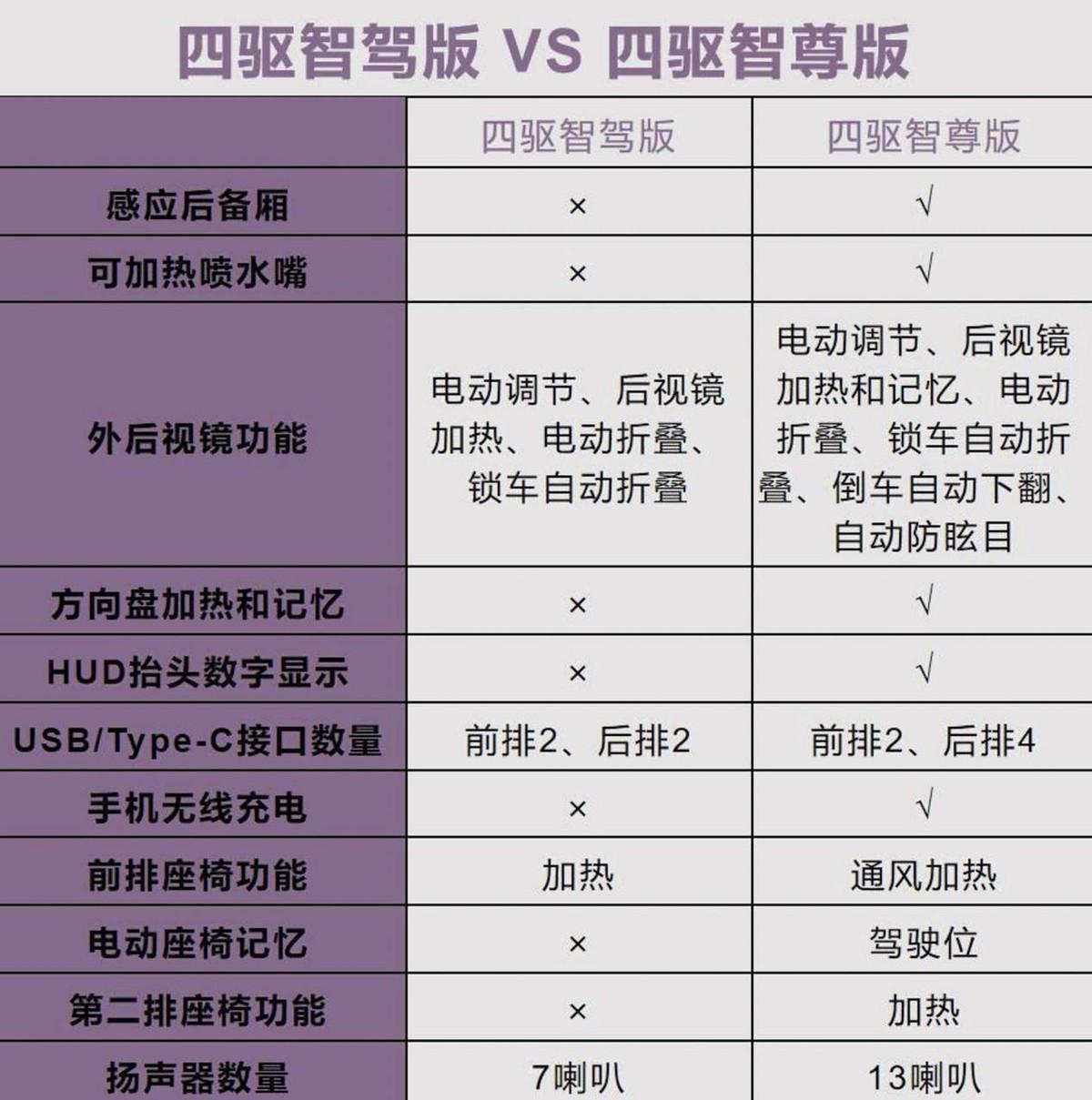總的來(lái)看,四驅(qū)智尊版的配置最豐富,比四驅(qū)智駕版多了感應(yīng)后備廂、HUD抬頭數(shù)字顯示、手機(jī)無(wú)線充電等配置。