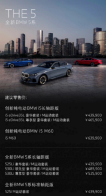 全新一代寶馬 5 系昨晚正式上市,該車提供燃油版、純電版 i5 兩種車型,以及標軸、長軸距兩種尺寸,售價 43.99 萬元起。值得一提的是,燃油版 5 系和純電版 i5 起售價相同。