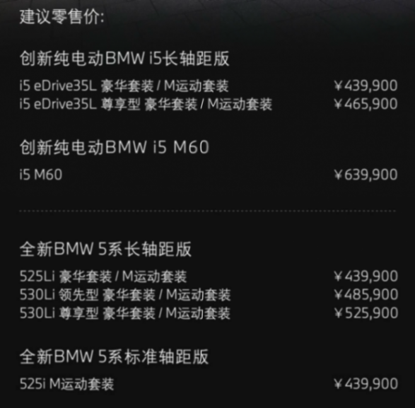 1月25日,全新一代國產(chǎn)寶馬5系正式上市,全新寶馬5系燃油版將提供7款車型供選擇,包括6款長軸距版以及1款進(jìn)口標(biāo)軸版車型,售價區(qū)間為43.99-52.59萬元。而寶馬i5將提供5款車型供選擇,包括4款長軸距版以及1款標(biāo)軸版車型,售價區(qū)間為43.99-63.99萬元。一起來看新車!