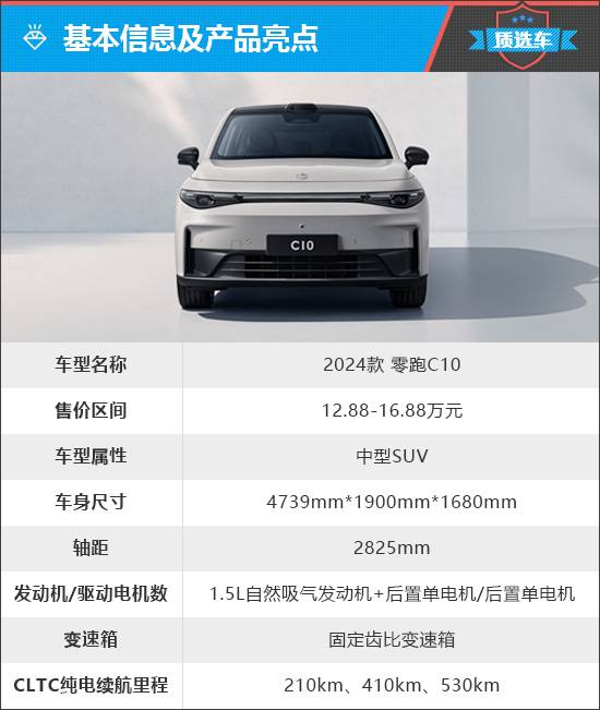 零跑C10共推出7款車型,有增程版和純電版可選,售價區間為12.88-16.88萬元。其中純電版車型電動機總功率為170kW,CLTC純電續航里程分別為410km和530km。增程版車型搭載一臺1.5L自然吸氣發動機,最大功率70kW,CLTC純電續航里程為210km。