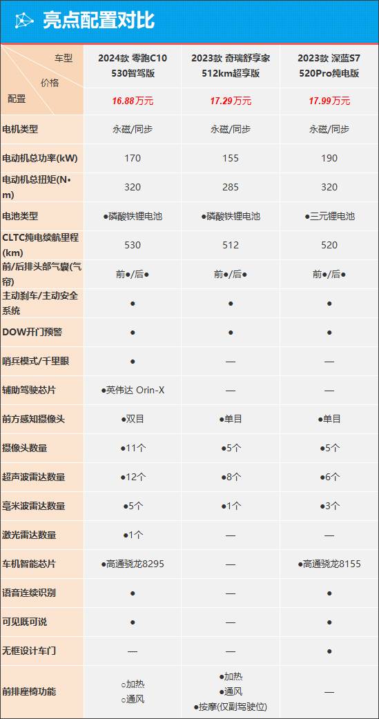 配置對比環節,盡可能選取三款價格相近的車型進行對比,其中零跑C10和奇瑞舒享家均為頂配車型,而深藍S7純電版由于定價相對較高,只能選擇入門版車型。從配置對比中不難看出,深藍S7雖然價格更高,但整體配置表現相比其他兩款車型并不占有太大優勢,但好在電動機總功率較大,擁有更好的加速體驗,并且采用了無框設計車門,開門時非常酷炫。零跑C10和奇瑞舒享家的價格相近,奇瑞舒享家勝在舒適性配置,例如搭載了前排座椅通風/加熱和按摩(僅副駕駛位),乘坐體驗更佳。不過零跑C10可以選裝前排座椅通風和加熱,并且配有豐富的主/被動安全配置以及智能化配置,例如哨兵模式/千里眼、128 線程激光雷達、英偉達 Orin-X 智駕芯片等,售價也是三款車型中最低的。綜合來看,三款車型中,零跑C10在配置層面占據了明顯優勢。