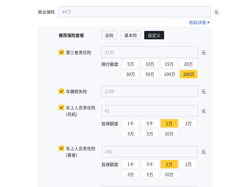 具體來看,我們?yōu)榱私y(tǒng)一標(biāo)準(zhǔn),按照目前這款車指導(dǎo)價(jià)格進(jìn)行計(jì)算保險(xiǎn)費(fèi)用,我們按照第三方責(zé)任險(xiǎn)為200萬賠付額來計(jì)算,價(jià)格為2133元,車輛損失險(xiǎn)為2189元,車上人員責(zé)任險(xiǎn)(司機(jī)+乘客)賠付額為1萬來計(jì)算共150元, 商業(yè)險(xiǎn)共計(jì)4472元,再加上交強(qiáng)險(xiǎn)950元,車船稅350元。一共為5772元。(每個(gè)車主的購買需求和保險(xiǎn)公司的銷售政策以及車輛年限,保險(xiǎn)價(jià)格會(huì)有變動(dòng),最終以實(shí)際為準(zhǔn)。)