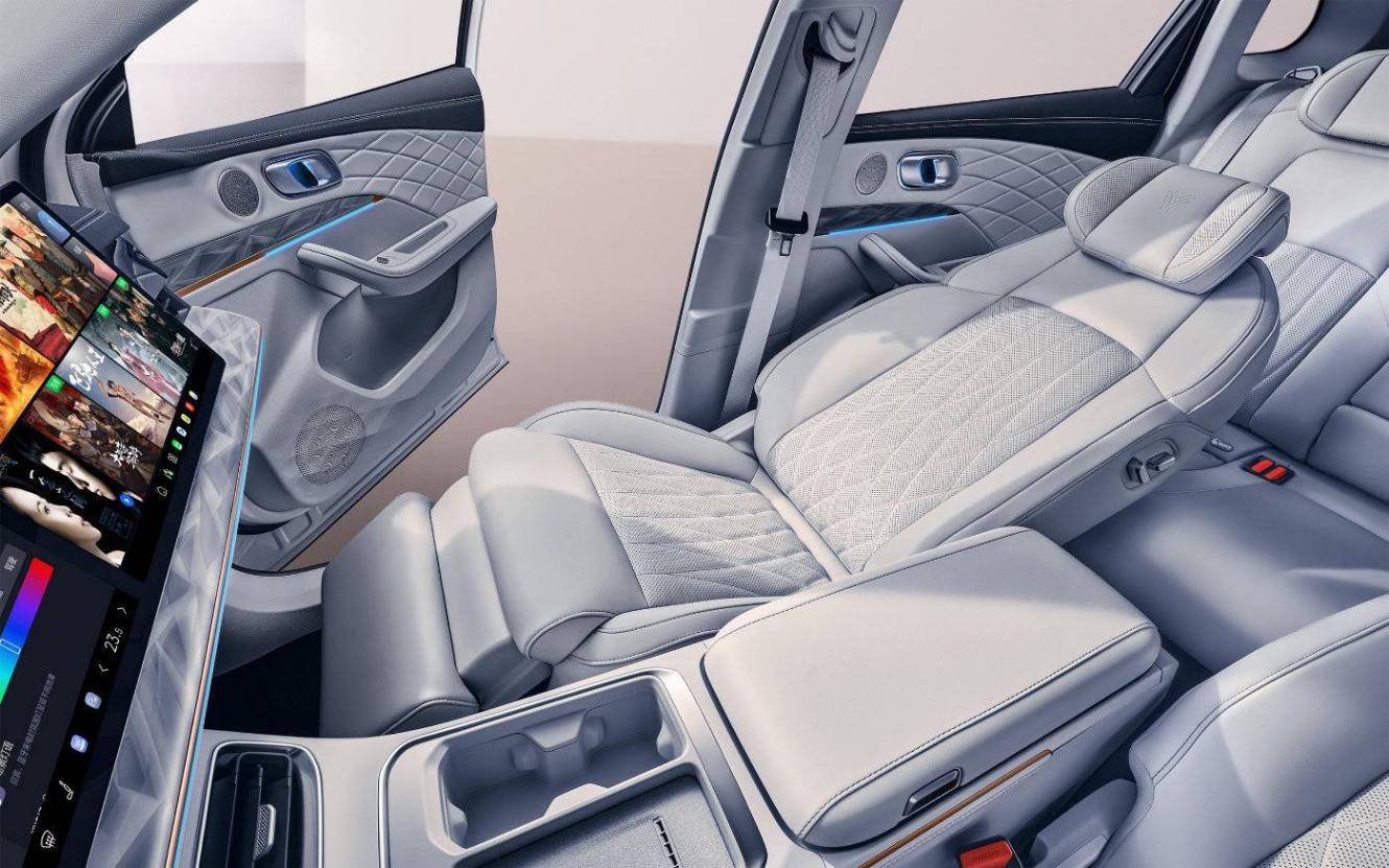 哪吒L的車內空間采用360°環抱式座艙設計,配合超越同級的大五座SUV體量、隱藏式儀表屏、雙15.6英寸超窄邊全高清屏“大彩電”、大量軟質內飾,讓駕乘空間更舒心。